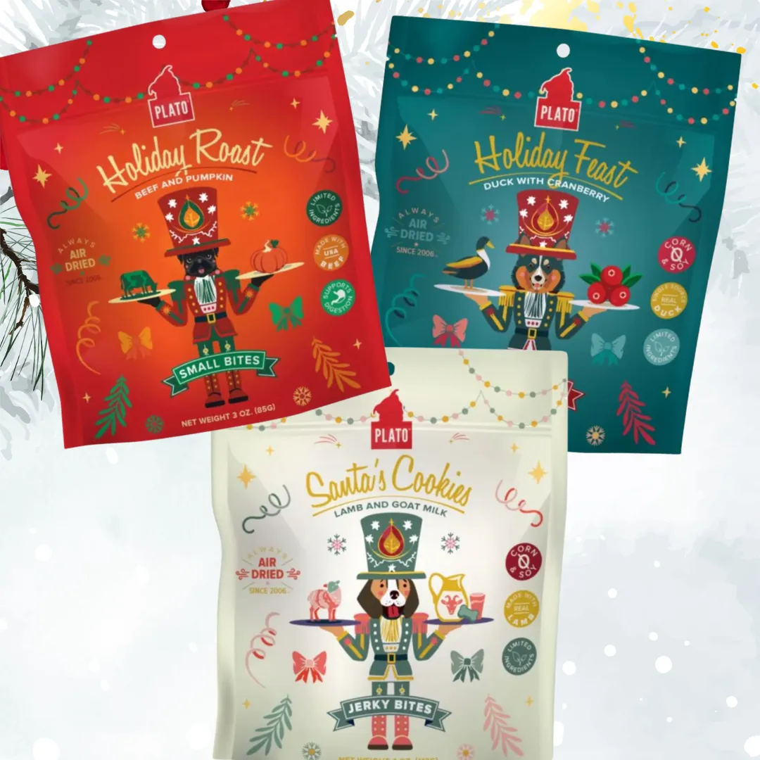 Treat your pup to the tastes of the season with Santa’s Cookies, Holiday Roast, and Holiday Feast from Plato Pet Treats!